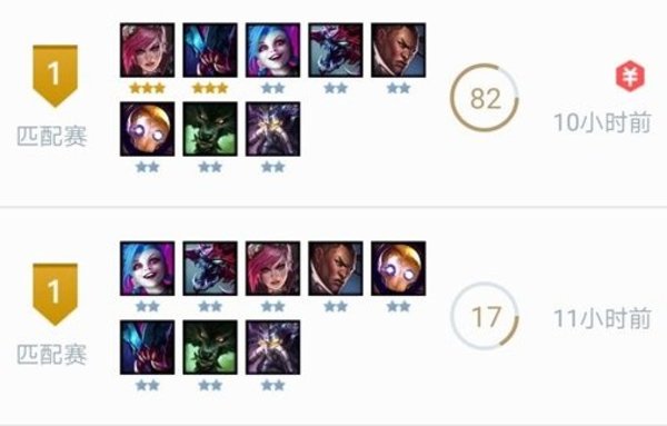 打工棋子要找好,打工技术要高超。这个阵容的优点就是过渡平滑,你看我发的战绩图有几个十几点血吃鸡的,基本上就是前期30+血倒数第一然后锁住的。不用太担心。