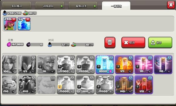 基本单位就是弓箭,法术为闪电,闪电最好要高科技一点,打黑油收集器时用到,我这也总共18万多一点,弓箭不想升的原因是因为不值得。全给弓箭太脆了 推荐带上胖子炸弹 遇到硬点的可以强推。
