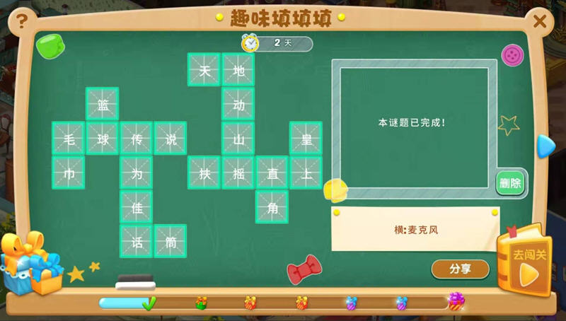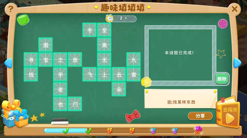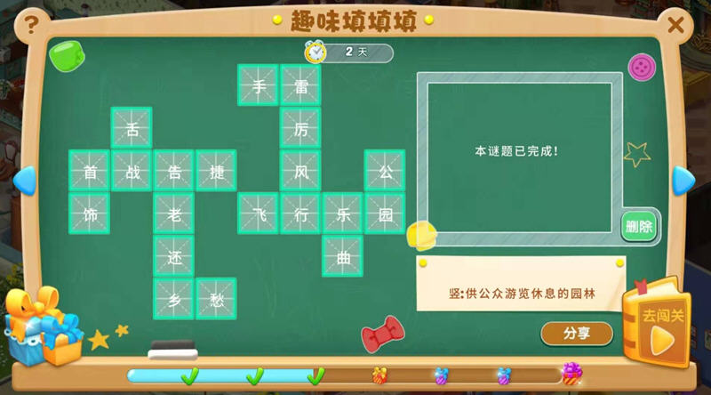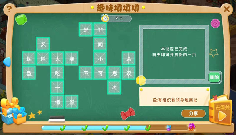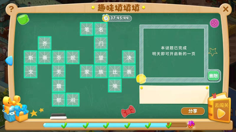 当你完成这关后,今天就任务就结束了,我继续明天的填字活动吧,系统会提示:本谜题已完成,明天即可开启新的一页,只能等到明天继续答题了。