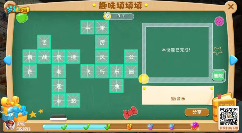 梦幻家园游戏大家开学季送上最新的趣味填填填填字答题活动,只要你完成填字活动就能获得官方赠送的大礼包,游戏大玩家现在整合上当前玩家通关的后答题截图分享给大家参考一下。