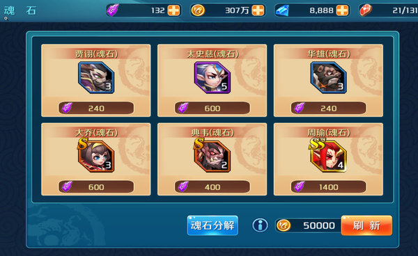 魂石是非常重要的资源,由于目前没有直接产出ss的副本,我们需要通过分解魂石去得到碎片,然后再商店购买ss碎片(目前魂石商店没有肉盾碎片) 一个紫色A 分解可以120个碎片,1400可以换四个ss碎片,其实并不是非常缺碎片,因为七天活动和封王再加上后面会出的翻拍活动ss碎片获得并不是太难。