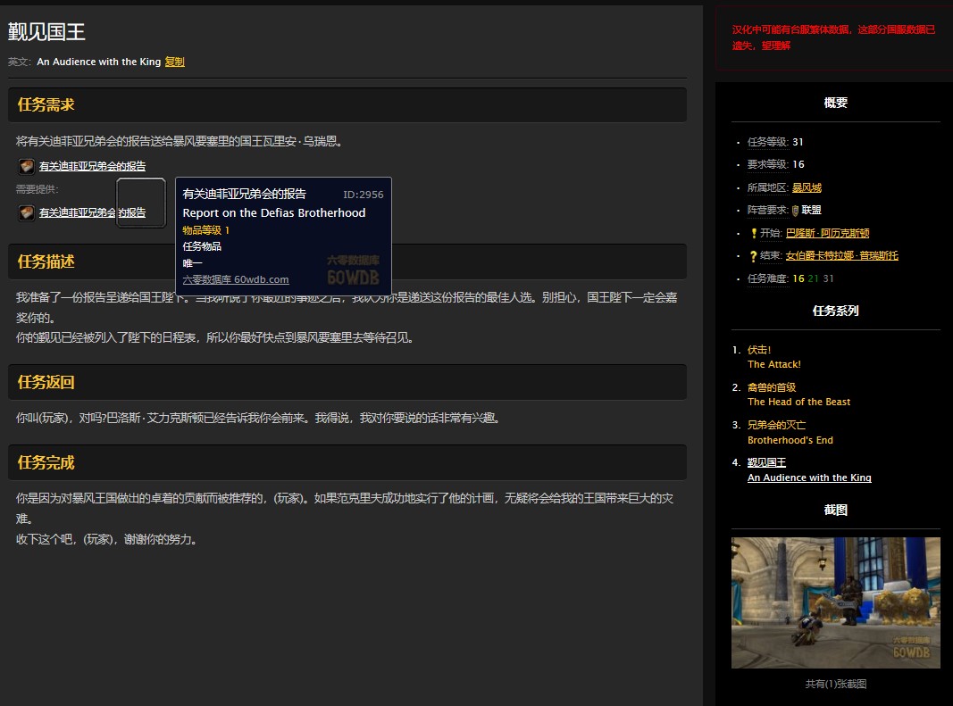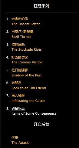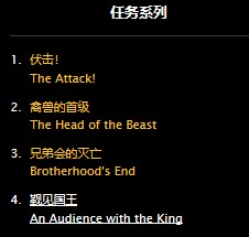 这个任务是一个非常长的主线任务,剧情很有意思,是从死亡矿井最终boss范克里夫身上掉落的信件开始的系列任务,任务线和起始任务描述如下: