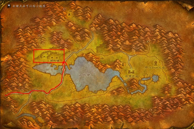 玩家到达三角路口之后,需要向上走,向下走的话会到暮色森林,低等级玩家过去会非常危险,然后到湖畔镇,在湖畔镇开启飞行点和接取任务,推荐玩家把炉石也绑在这里,因为赤脊山地图还是比较大的,有时候跑回来不方便,以下是赤脊山路线图:
