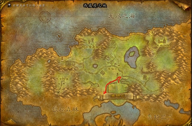玩家从幽暗城出发,出城之后直接往西方向走,很近的地方有个岔路口,再向北走就能到达银松森林了,具体路线图如下:
