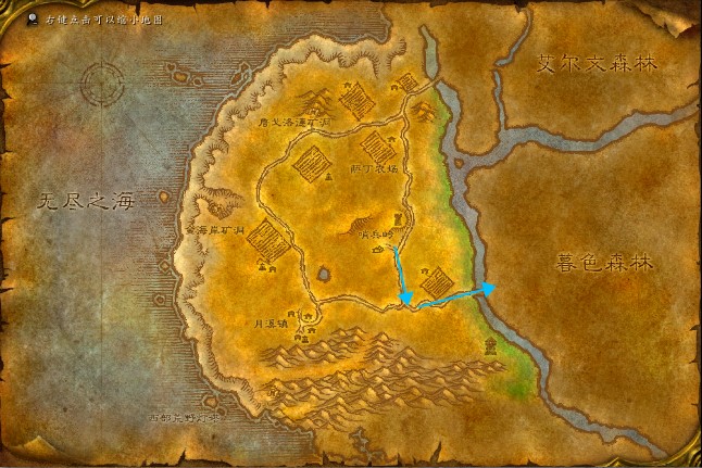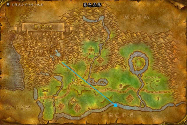 玩家可以从暴风城出发,然后笔直向北走,穿过艾尔文森林北部的河流,直接走到暮色森林的阳光树林。