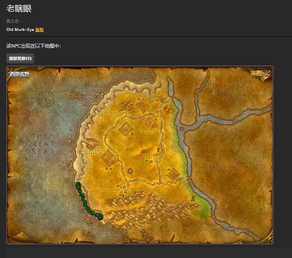 然后老瞎眼是一只20级的鱼人,就在海岸沿线上四处巡逻,下面是老瞎眼方位和数据: