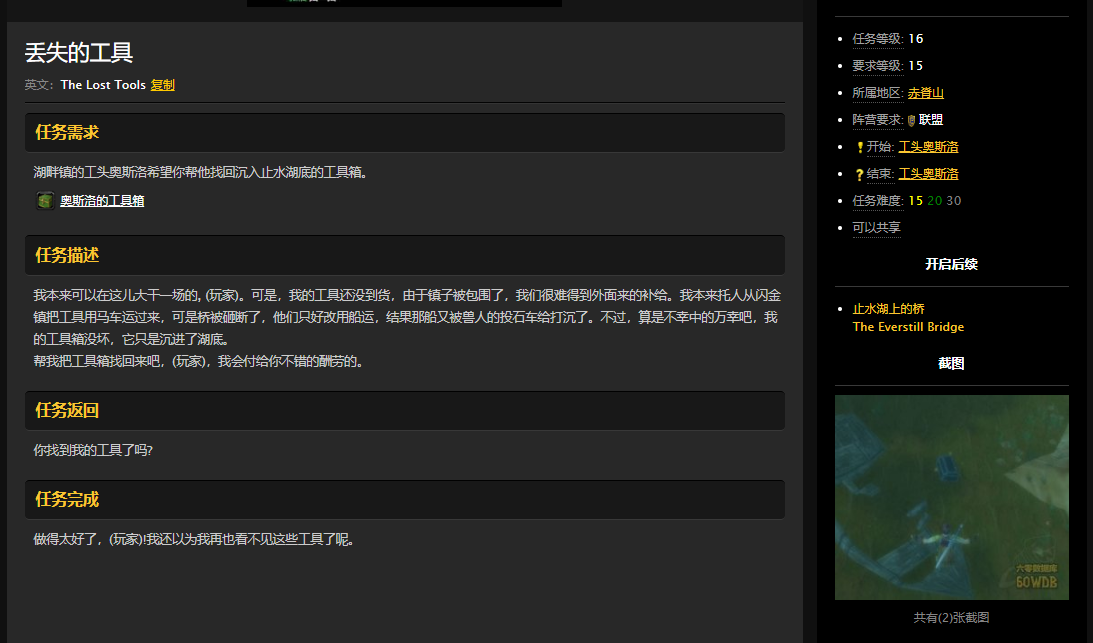 玩家会在赤脊山止水湖的桥头工头奥斯洛处接到这个任务,玩家需要深入水下寻找奥斯洛的工具箱,任务内容如下: