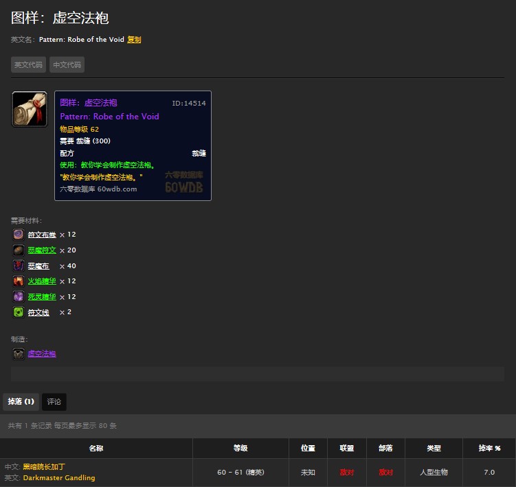 图纸有黑暗院长加丁掉落,他是通灵学院的最后boss,有小几率掉落虚空法袍图纸。