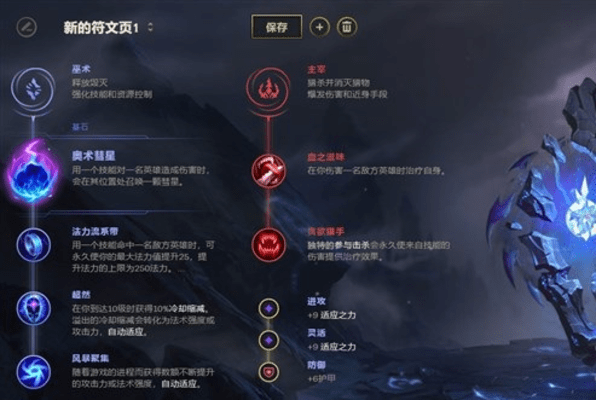 上单位置大头选择彗星符文,搭配固定的法师符文流系带与超然,最后一行如果为了更好地打对线消耗可以点一个焦灼,如果更注重成长属性则可以点风暴聚集,副系则为了提升赖线能力点出血之滋味与贪欲猎手。