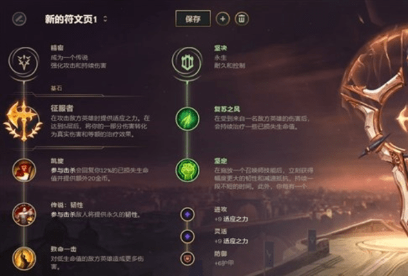 最适合新版盖伦的基石符文就是征服者,E可以快速叠满征服者效果,同时搭配凯旋与致命一击符文,以及盖伦必点的一个传说:韧性。