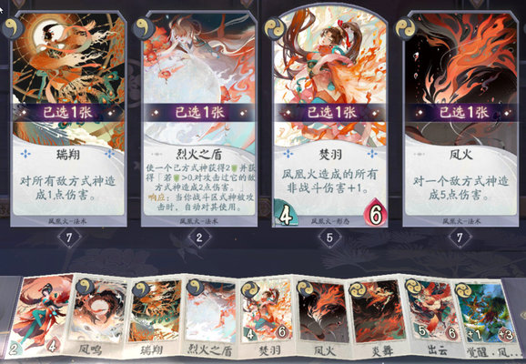 配卡思路:对所有敌方式神造成伤害的“瑞翔”具有群攻补刀的能力,负责解场和压制的“凤火”可以攻击准备区的式神,也能选择攻击战斗区的式神。