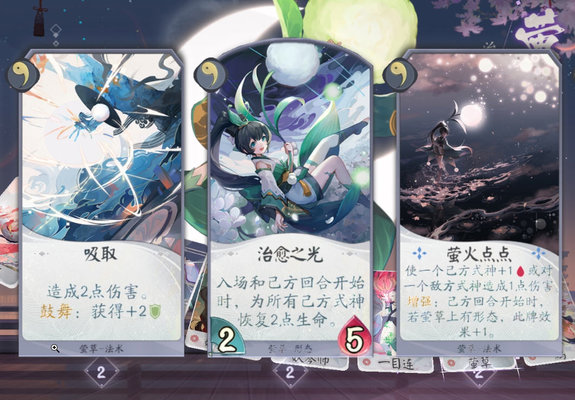 萤草:萤火点点有形态就能在回合开始获得+1效果,也就是说,两个回合就能长到关键的3伤害。就算不需要当做直伤来用,也能给队友加体力上限。不过小心鬼抽,需要两个同时上手才有效。经常配合桃花妖养狗,建议带上足够的过牌。