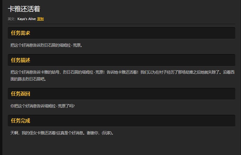 玩家在做完护送任务之后在卡雅的爸爸那里接取任务,这个任务是护送卡雅任务的后续。