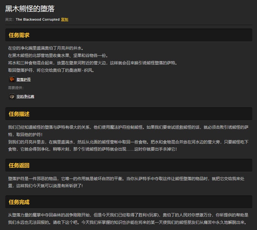 玩家接到任务要求玩家前去黑木熊怪的营地寻找诱使他们堕落的萨特。