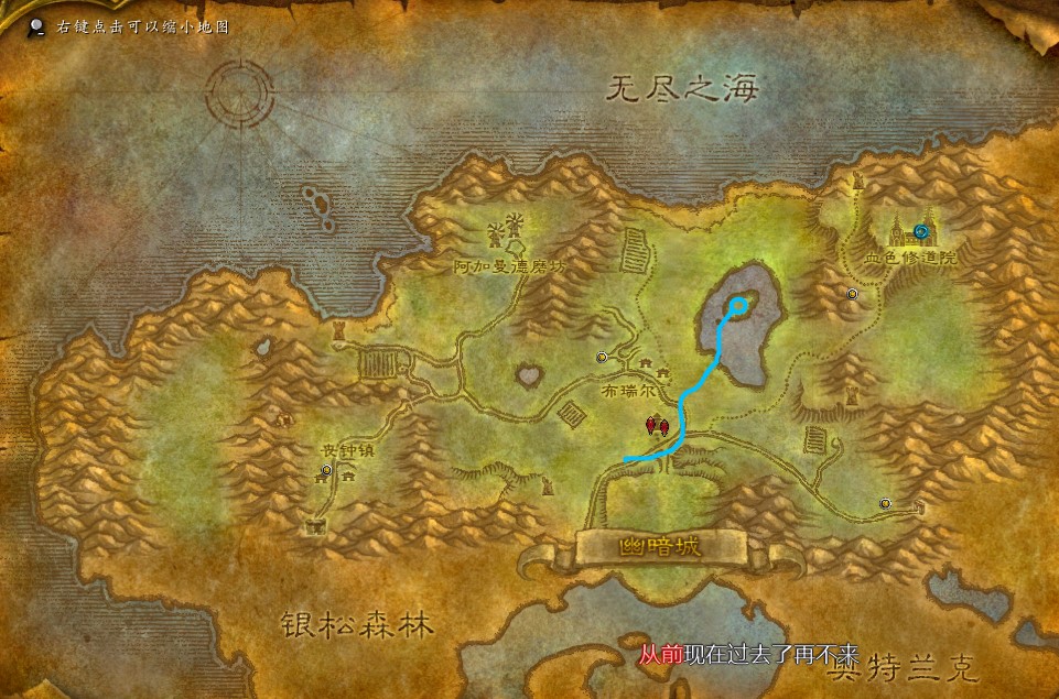 玩家从幽暗城出来之后需要一直向北方走,走到湖边。