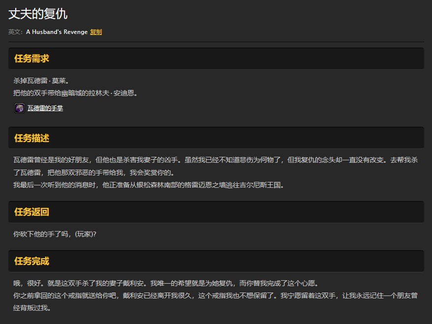 玩家可以在幽暗城贸易区的拉林夫处接取到丈夫的复仇任务。