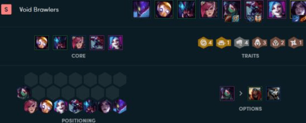 虚空斗刺的阵容在9.21版本稳稳的位于版本的S级的榜首,这个阵容在科加斯为首的英雄得到加强以后在版本中就成为了非常好用的上分选择,斗刺的阵容前排有着斗士提供超高的坦度帮助团队去规避伤害,同时刺客还能轻松的进场打出强劲的收割效果,非常给力。