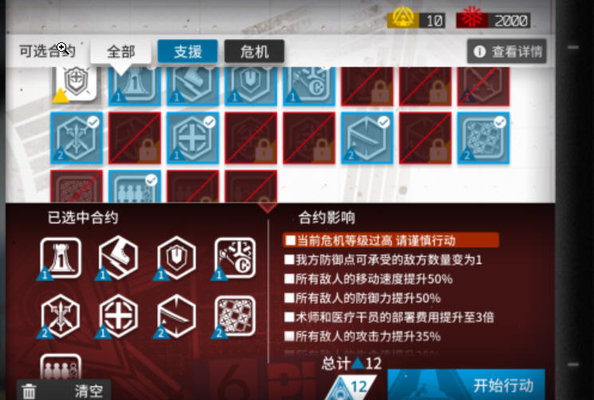 这一关可以自己挑debuff叠,选的越多难度相对越大,医疗图标的两个debuff是给怪加血,盾图标的debuff是最恶心的,让你所有干员减防70%,不打12最好别选。