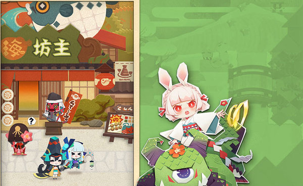 聚餐途径②:平安町的海坊主豚烧也是个不错的聚餐地,点击海坊主豚烧店面,选择四位小妖怪一同进入,即可体验专属小纸人点菜传菜服务。