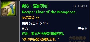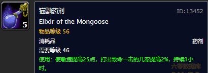 猫鼬药剂能够增加2%的近战暴击以及25点敏捷,持续一个小时,没有cd。适用于所有的物理输出职业。