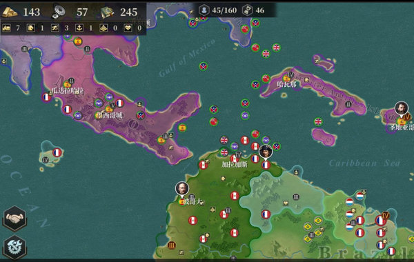 46回合打完了,开局拖法国两回合,然后部队登陆,上一个海将一个骑将一个炮将,直接强取法国南美唯一据点。