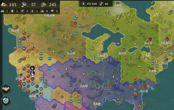 法国挺简单的,毕竟初始兵种强悍,破城比较快。本土部队快速解决南美,大西洋舰队,打了英国小岛直接登陆美加英土混战的地方偷城就可以了。