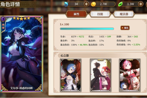魔法器方面:1 2号位置用附灵之戒,3号位也是找个加攻击的就行。心之器也是上加攻击的,没有就连击率。堆攻击属性就行。