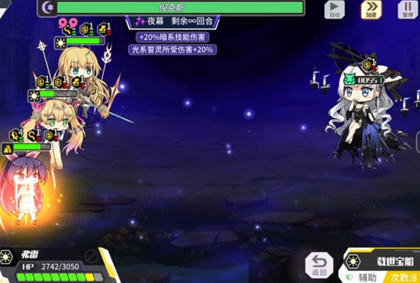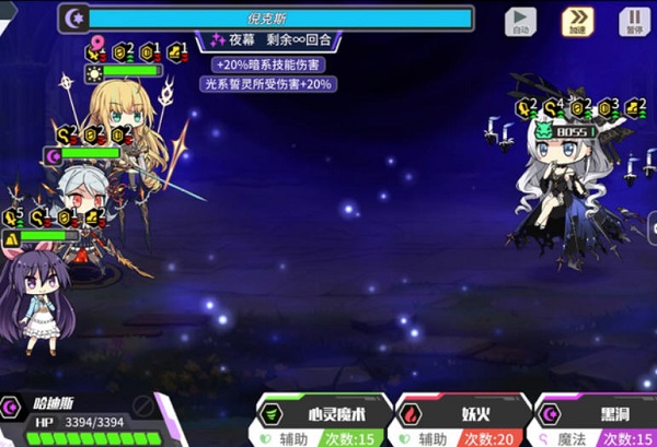 然后~风子用风子参上给阿尔忒弥斯,阿尔忒弥斯用月耀连射,泡泡用空间箭,尽量在Lv1、2把buff和debuff叠起来,接近满血状态,不够血了就风子祈祷、箭神自我修复,泡泡不用管。