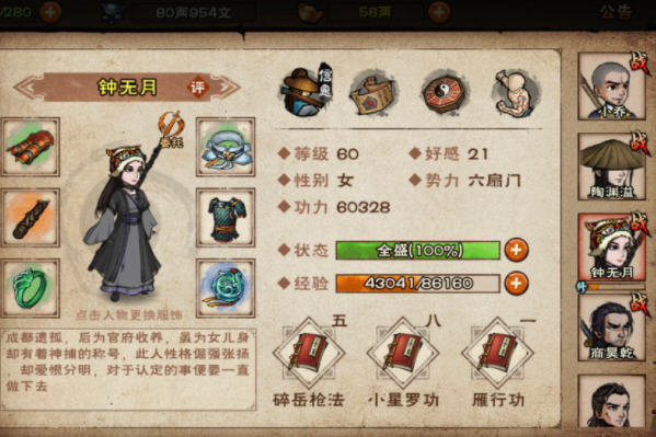 其他没什么好说的,可以买个杨把苏剑换掉,毕竟六扇门没有镇剑,你不可能一直用血衣吧,所以有条件还是换了吧,或者让钟走棍,买个商也可以。